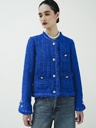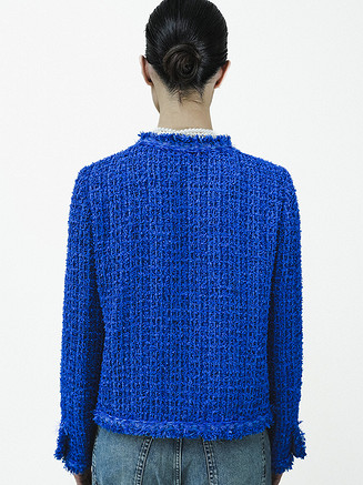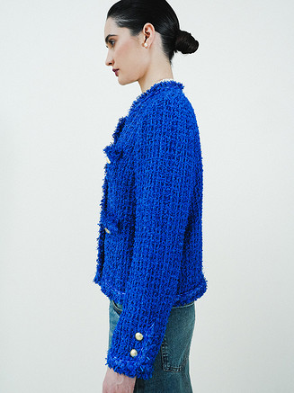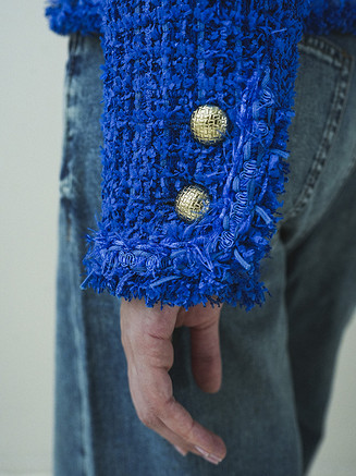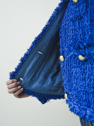 Жакет выполняется по бесклеевой технологии дублирования шелковой органзой, которую используют в кутюрных модных домах. Такой прием сохраняет пластику ткани и позволяет жакету мягко облегать фигуру. Верхние края карманов, срезы бортов, горловины и низа декорируются тесьмой и бахромой, изготовленными вручную.