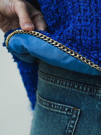 На курсе вы сошьете твидовый жакет в стиле Chanel с применением люксовой технологии пошива. Модель классического прямого силуэта, длиной чуть выше линии бедер. Жакет без воротника, с центральной застежкой на петли и пуговицы. Изделие дополнено накладными карманами. Рукава втачные, двухшовные, со шлицами на пуговицах.
